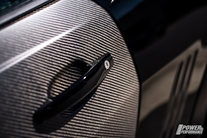 There were over sixty tack welds that had to be drilled out to remove the factory roof and install the carbon fiber replacement. “This was probably the hardest thing to do because it was completely irreversible and the car was brand new.”