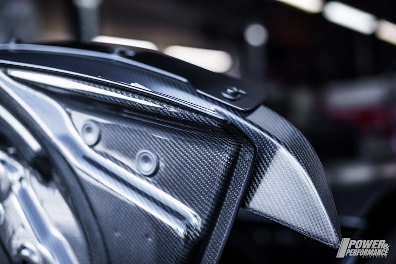 As if that wasn’t enough work, every piece of carbon fiber was taken back off the car and sent out for paint and buff. “I wanted to make sure the fitment was perfect, and all of the carbon weaves were aligned the way we wanted it before we painted it. The carbon fiber was sprayed with 5 coats of PPG Vibrance Clear, then blocked and buffed,” DeLano said.