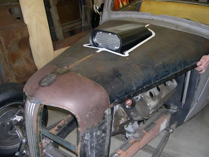 Weeks previous, John had been given a ’38 Dodge pickup body and bed by a friend – it’d been blasted to bare metal and then the friend lost interest. It sat outside his garage, in the Colorado snow, and rain – developed surface rust. John hauled it home thinking maybe he’d build a simple roadster pickup-type. Chad’s rat rod dreams changed that.