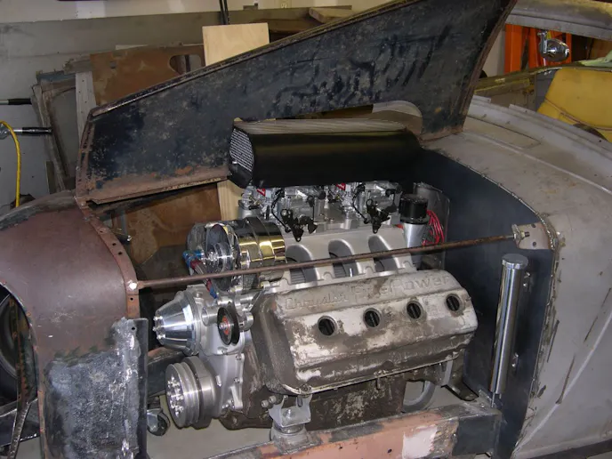 With the body close to completion, the 1956 354-inch Hemi and a GM 700 R-4 tranny was adapted and painted, and snuggled into the frame. Dual fours were added and Lakes headers made it look more like a hot rod – a deluxe hot rod.
