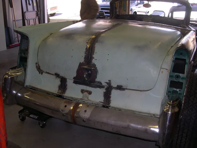A crusty 4 door was purchased and the rear, just behind the doors, was removed and narrowed 15 inches. In order to retain the taillights, the rear bumper needed to be shortened as well. The Chrysler tail was mated to the Dodge pick-up body at the rear of its doors.