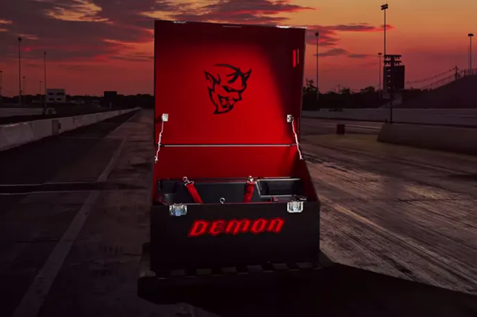 For starters, we see that Direct Connection, and that the tools will include the Demon brand. The Crate is organized, inside it appears to have compartments that hold those track tools, which includes a floor jack, a torque wrench, an electric impact gun, and a tire pressure gauge. If we try to read between the lines, it makes us wonder if the helmet, gloves and maybe even a Demon-inspired racing suit or jacket makes up part of those 18 components? We’d love a limited edition Demon jacket, are you listening Dodge?