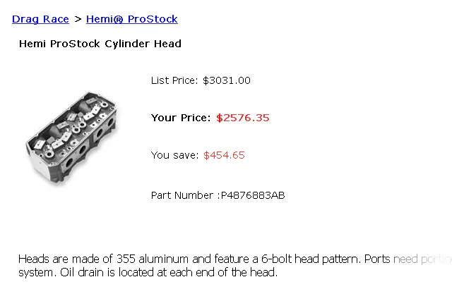 A search on that phrase brings up a lot of questions, and even one site we found listed the Mopar Performance Hemi ProStock cylinder heads (PN P4876883AB) as a special price of $2576.35. We found that rather odd, because that site states the list price is $3031.00 where other sites have the list price as $2000.00, with a sale price of $1920.00. So how is it that two sites selling the same cylinder heads have $1031 difference between their list prices? It is odd.