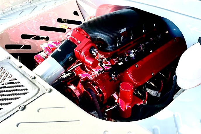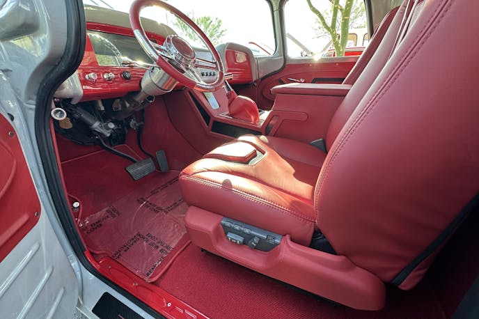 Power comes from a bright red 6.0-liter LS, bored and stroked to 416 cubic inches. The LS is topped with a Carbon PTR intake manifold by Performance Design — “the icing on the cake,” as SCC calls it. Power is transferred through a 4L80 automatic transmission, while a Holley Terminator X Max with a 12-inch in-dash display takes care of engine management.