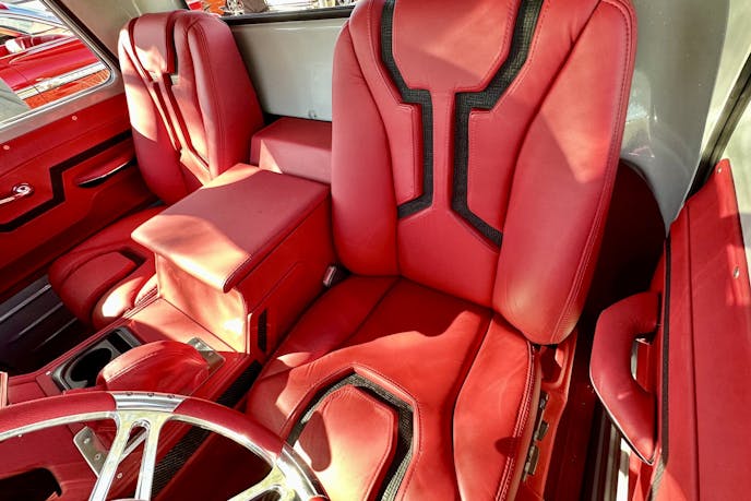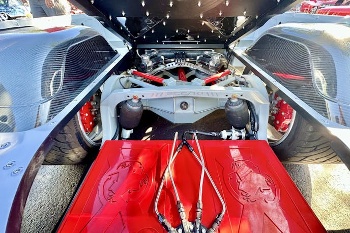 Lift the hood and the wow factor hits hard. It’s hard to miss all that carbon fiber and red paint.