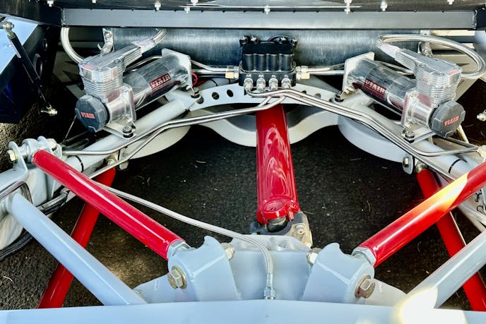 The truck’s low, menacing stance comes courtesy of a Level Ride air-management system. Air is supplied by Viair 480C dual compressors and stored in carbon fiber/billet tanks from Square Tank. Suspension is handled by Fox adjustable shocks all around — ShockWaves in the rear and Slam Specialties bags up front. Carbon wheel tubs from Munsey Speed finish the look. The result is a system that lets Patches slam low for shows and rise for smooth street function.
