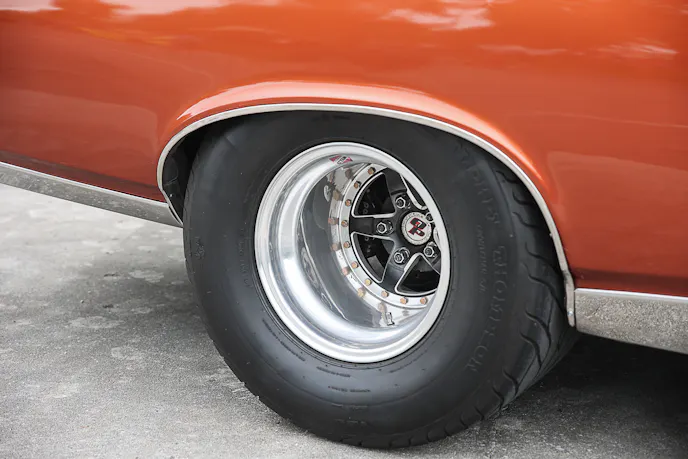The car is running a stock frame with UMI suspension components. In the front are tubular A-arms, and out back is a 4-link coil-over setup. The car is running a Ford 9″ rearend with 3:55 gears. The GTO has four-piston Wilwood brakes all around. The torque arm, panhard rod, and frame connectors are also UMI. This old Goat rolls on lightweight Weld Wheels and Mickey Thompson tires.