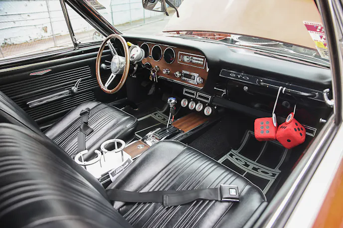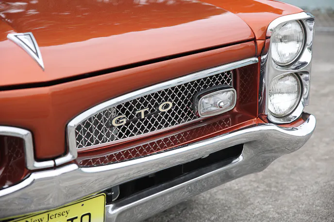 The 1967 GTO received an engine upgrade, featuring a bigger 335hp, 400cid powerplant. Unfortunately, it lost its iconic tri-power engine option. The styling was freshened up as well. The grille underwent revisions, tapering toward the center but retaining the stacked quad headlamps. The GTO emblems also moved from the rear fenders to the chrome rocker panels. Also introduced in 1967, the factory Rally II wheels became a Pontiac styling signature lasting well into the 1980s.