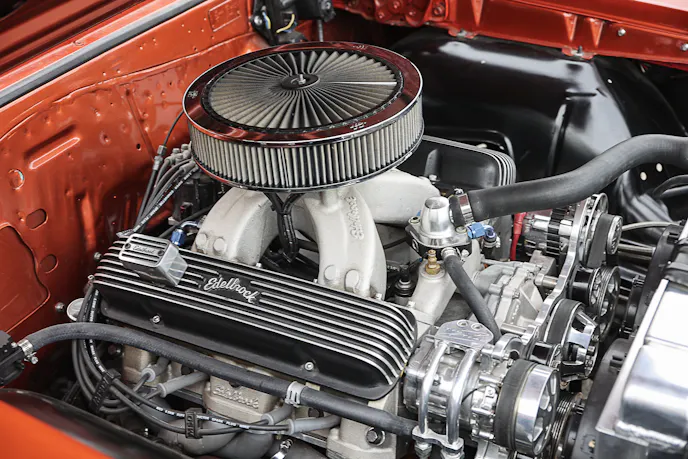 The body was in pretty good shape for being an East Coast car. When it was stripped and straightened, they tubbed the rear wheel wells and installed a roll bar for safety. Other than that, Sal kept the body fairly stock-looking. When all was said and done, the wild shade of Cry Baby Orange was touched up to perfection.