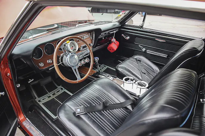 Inside the cockpit, Sal stayed with a mostly stock feel that echoes the exterior. Of course, the rollbar isn’t stock but most other components are true to Pontiac stylists from back in the day. Sal went with Classic Instruments for a factory-correct look, and added a center console with cupholders, along with a custom Sparc steering wheel. The car sports a B&M shifter, a column-mounted tach, Vintage Air, auxiliary gauges, and a custom stereo system. The seats and door panels are original to the car sporting old-school die-electric detailing.