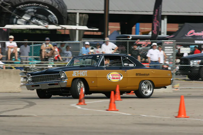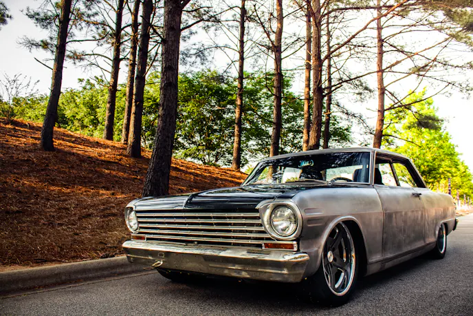 The Angry Nova sits atop a complete Detroit Speed Chevy II suspension with JRi Shocks and a Detroit Speed Built Ford 9-inch rear end. Baer 6R 6-piston Calipers peak out from the Forgeline Grip Equipped Rodster wheels. The Nova is powered by an LS7 engine built by Kurt Urban, mated to a Tremec T-56 transmission.