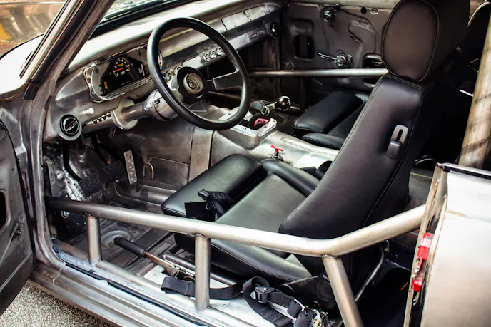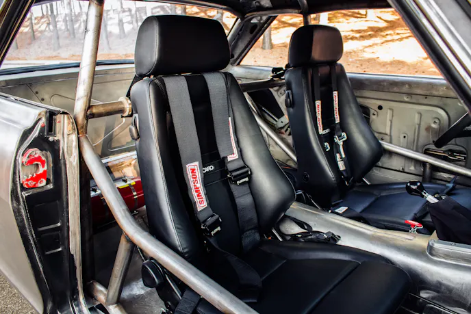 The steel interior is also bare and holds a custom roll cage along with Recaro Specialist Seats and a fire suppression system.