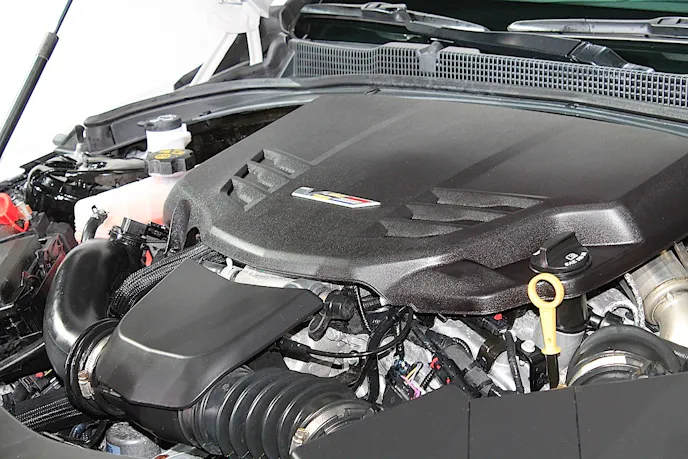Under the hood is a good reason for those performance brakes. Cadillac’s twin turbocharged V6 engine is putting out 455 horsepower and 445 lb-ft of torque. This is the most powerful six cylinder in its class, and puts the Cadillac to 60 mph in a scant 3.9 seconds. That power continues to push the car to a top speed of over 185 mph, making it not only a factory ready track car, but a seriously potent one at that.