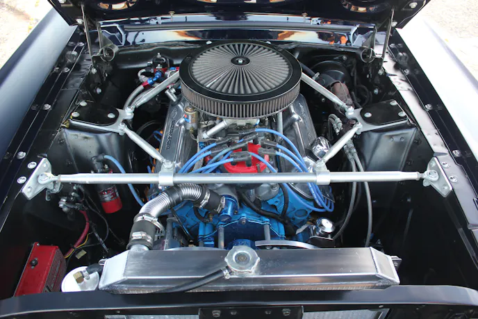 Brian’s ’68 Cougar version 2.0, is powered by a worked Ford 302ci engine saved from his first car. It’s beefed-up with ported GT40 heads, bigger valves, an aluminum Edelbrock intake manifold, and a Holley 750cfm 4-barrel carburetor. Inside the small-block is a balanced stock crankshaft, forged 10.1 pistons, and a high-lift Edelbrock camshaft. Brian puts output at 400hp/350 lb-ft at the crank.