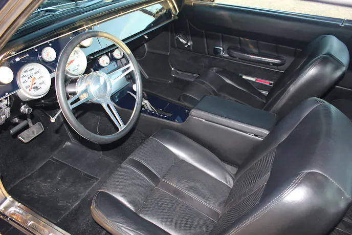 Brian’s body and paint-work are as impressive as what makes it go. The panels are straight as arrows, and the mini-tubs look factory, but it’s the mile-deep paint that draws you in. Brian started with a Glasurit (BASF) Bentley dark blue hue and added black to darken it even more. At first glance in anything but the brightest sunlight, the Cougar appears black.