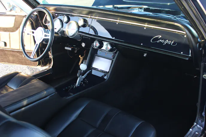A full allotment of Autometer gauges monitor operations. The late-‘60s radio has been replaced by a Kenwood Bluetooth unit and backup camera. The lens is cleverly mounted under the rear bumper. Like a signed work of art, “Cougar” adorns the passenger-side of the dash face, tastefully handpainted by Nelson Medina Pinstriping.