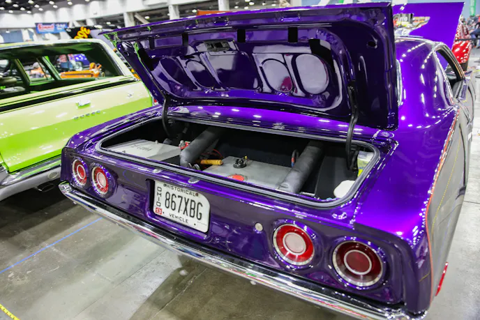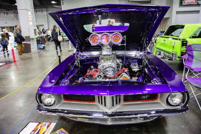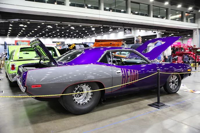 The late Jeff Donkin did the paint and chassis, including the three-link rear suspension. The color is called Purple Rhapsody and it is out of the Dupont Hot Hues catalog. The Billboard stripes were painted on in a contracting silver/grey with purple Hemi callouts.