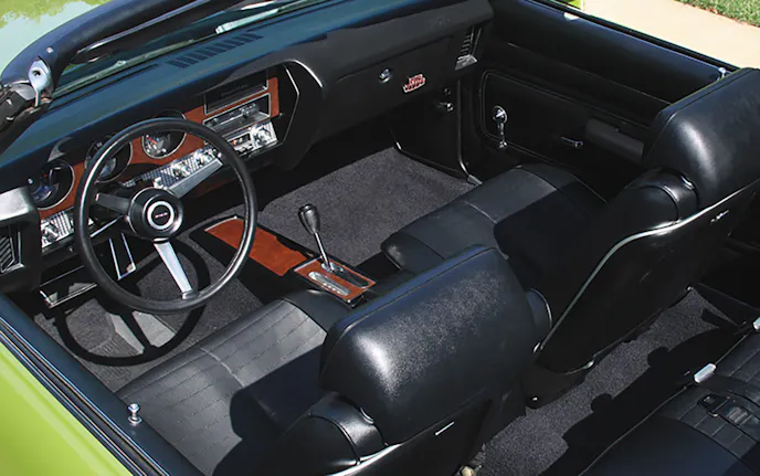 All Judge models came standard in ’71 with the Ram Air IV hood induction kit. Options on the 1971 Judge convertible included the Turbo Hydra-Matic 400 three-speed automatic transmission, a Ride and Handling Package, bold honeycomb patterned wheels, a hood-mounted tach, body-color sport mirrors, power brakes, and a “Formula” steering wheel. Interior amenities included a gauge package for the dashboard, air conditioning, power locks and windows, a floor console, AM radio, and an 8-track tape player.