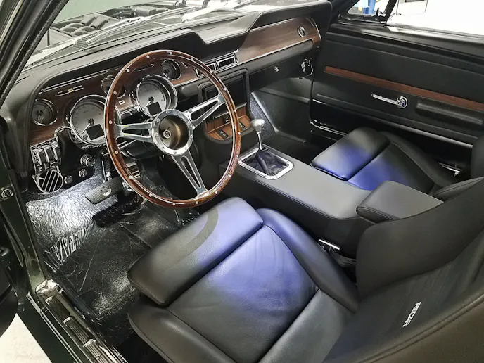 Cooper’s Mustang is powered by one of Ford’s Aluminator engines and backed by a six-speed automatic transmission. This engine package makes Cooper’s Mustang extremely reliable, but also gives it plenty of horsepower. The Aluminator looks like it belongs under the hood of a 1968 Mustang thanks to all the work that Innovation Performance Technology puts into the engine swap.