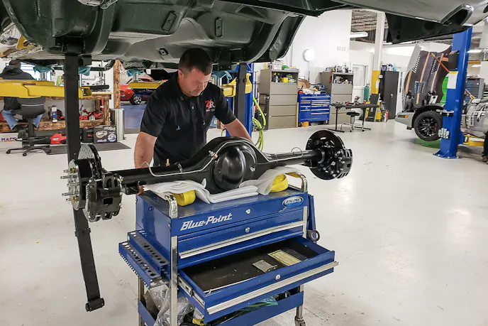 Inside the Mustang, you’ll find an interior that looks stock, but in reality, has been upgraded with modern touches. A full set of Dakota Digital gauges were used to work with the new Ford driveline. According to Marshall, those digital gauges will work like a set of newer OEM gauges and will alert you to any issues the engine or transmission is having.
