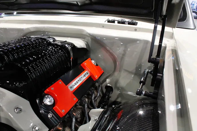 The steering wheel was scratch built, as was the pod for the Racepak gauges. Under the hood, the the twin-screw Whipple supercharger received extensions that make the supercharger look a bit bigger than standard, and up front the bumper was extended to the wheel opening below the fender. The oil cooler scoop was built into the lower panel and bumper to help keep the LS7 cool.