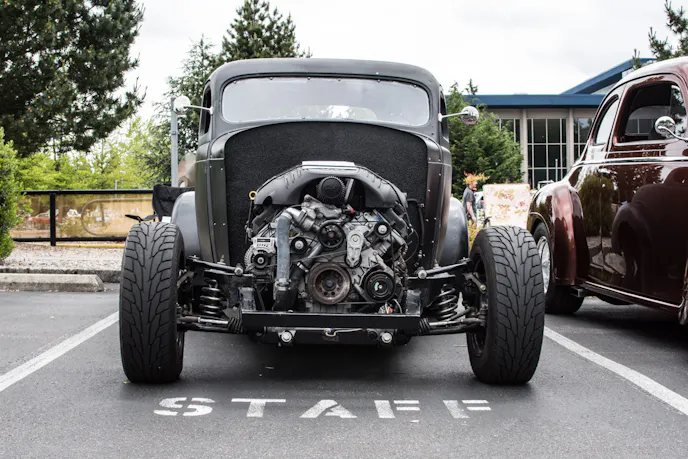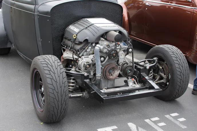 When we first saw this 1935 Plymouth street rod, we knew right away there was something different about it. Beyond the obvious absence of front fenders, hood, grill, and anything at all that goes in front of the engine, there was something else off about it. The 5.7 liter Hemi powered Plymouth was missing the radiator and any kind of cooling fan off the front of the motor.