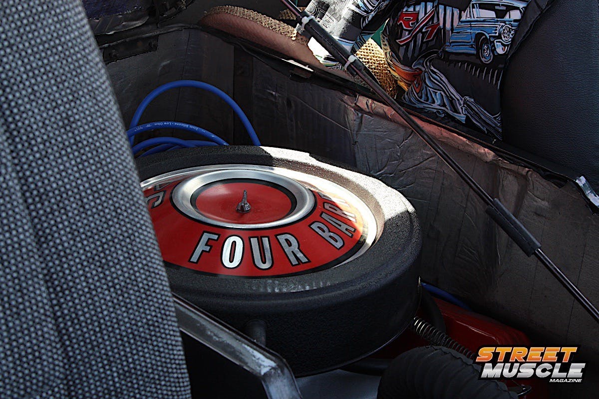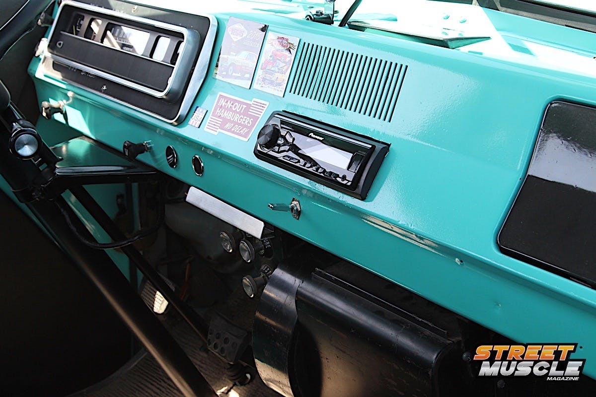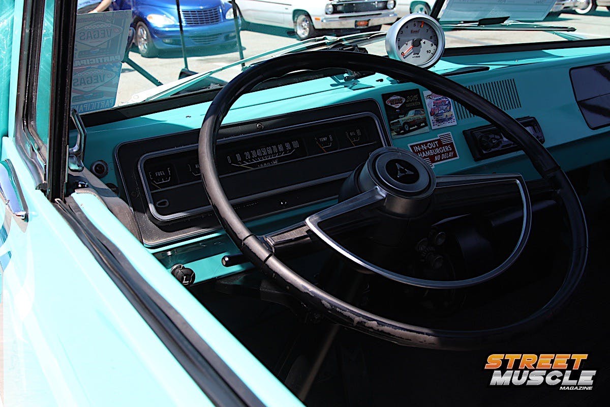Under the 15×7 and 15×8-inch wheels he’s retained the stock drum brakes, and the truck is suspended on the stock leaf springs out back. The 3.55:1 8-3/4-inch rearend is fed from the stock manual transmission with three-on-the-tree handling the shifting duties.