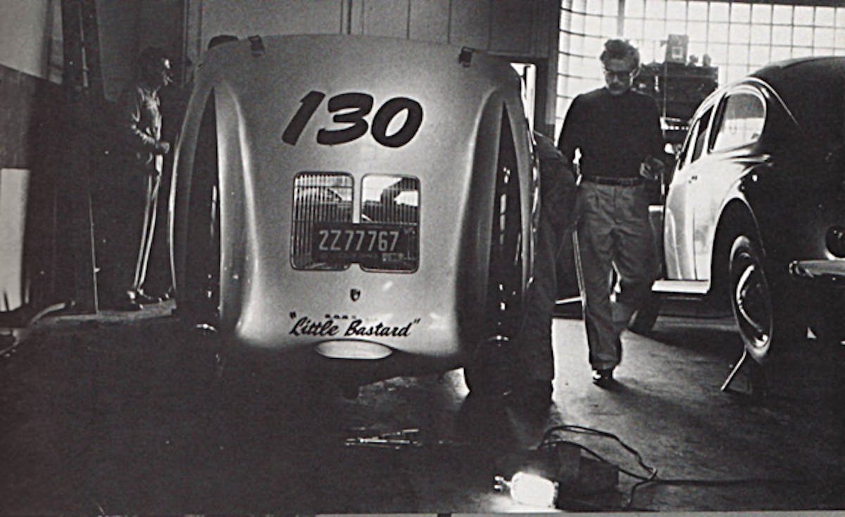 Upon receiving the car, Dean took it to the shop of famed car customizer, George Barris, whom Dean had met on the set of Rebel Without a Cause. Dean had Barris appoint the seats in tartan plaid, paint red stripes over each of the rear wheels and plaster the number 130 on the car’s doors, hood, and engine cover. Dean’s car then went next door to the shop of legendary pinstriper Dean Jeffries, who painted “Little Bastard” on the rear cowling. It was a nickname Dean had acquired by friend and stunt driver Bill Hickman.