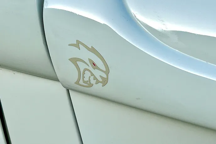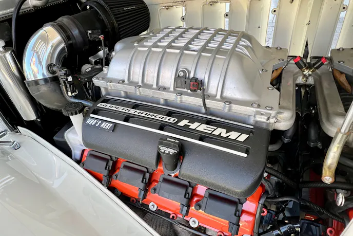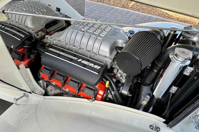 One thing you won’t find under that lovely louvered hood is a Chevy engine. Beneath the four-piece bonnet is the heart of the modern Mopar performance revolution: A 6.2-liter supercharged HEMI. Coming out of a wrecked Challenger, the Hellcat powerplant is mated to its original eight-speed automatic. Except for the headers, which were fabricated by George’s longtime friend Ed Britz, Flowmaster mufflers and 2.75-diameter exhaust, the motor is as it left the assembly line.