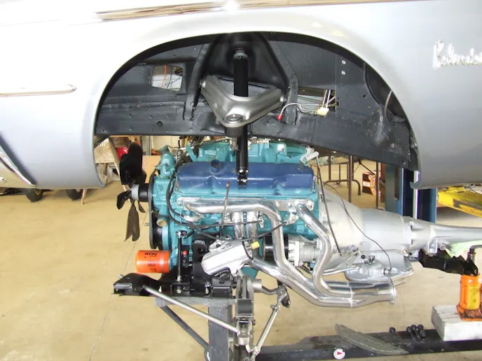 The crew reinstalled all of the polished and anodized trim to the exterior, and all lights and emblems were attached to the car so that the engine and front K-member could be assembled, and the completed car lowered into place.