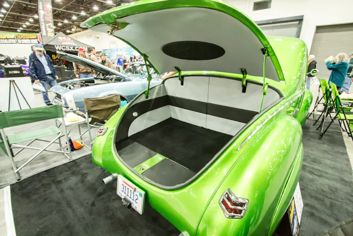 An additional feature of note includes the use of rear folding jump seats from a 1995 Ford Ranger to transform the business coupe into an opera coupe. Quite a bit of fabrication was needed to make this modification and it is something that Tom is quite proud of. Additionally, Tom made the decision to remove the rear window vents, rain channels, and the separator for the windshield in favor of a more streamlined appearance.