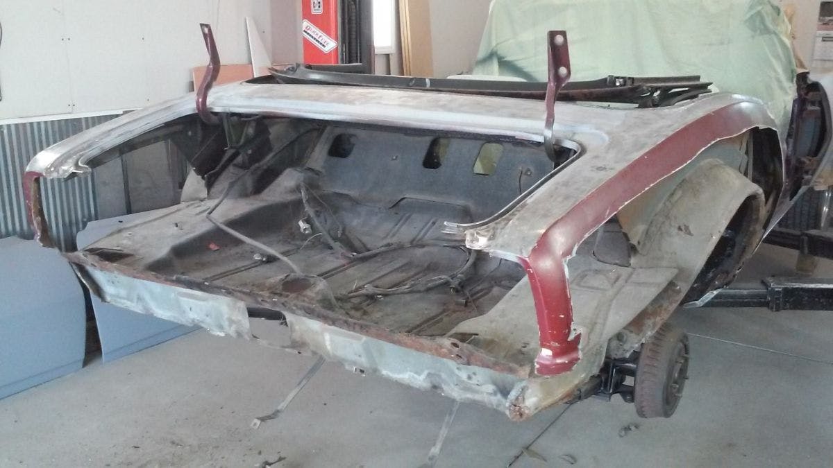 The body was in good shape and still features the original factory sheetmetal. There was no rust on the floor pans, front fenders, or doors. The hood had been worked on previously, and needed some minor repair. The rear quarters had minor rust above the wheel openings, but none on the inner fender wells. Gary replaced the rear quarter panels and the rear tail panel with new units.