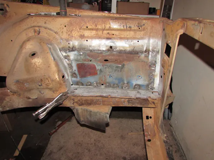 Although it was a Texas panhandle car, it had a fair share of rust. Rod ended up replacing both quarter panels, one outer wheel house, trunk floor, trunk floor extensions, one rear floor board, deck filler panel, gas tank braces, trunk gutters, lower front windshield corners, and many patches in the floor. The speaker tray, windshield frame, hood hinge area, inner fender area near the battery were repaired as well. There is nearly a year of work getting the car to be rust free. All the metal work was done by Rod for the first time.