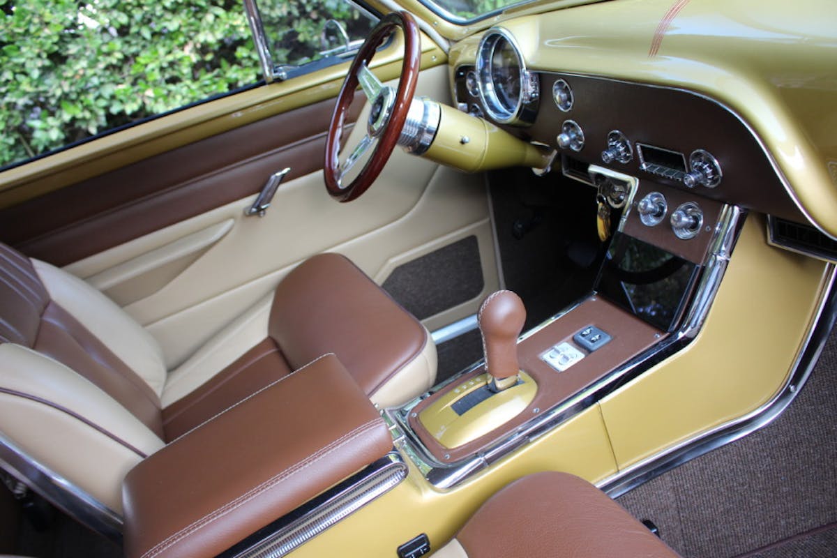 “Dave Putnam did the interior. He’s done two other cars for me, he’s a good friend and I love his work. We chose a tan and baseball-mitt color combo that really works well with the exterior paint. The console and front seats are out of a 1965 T-Bird. I extended the console and added bolstering to the seats.