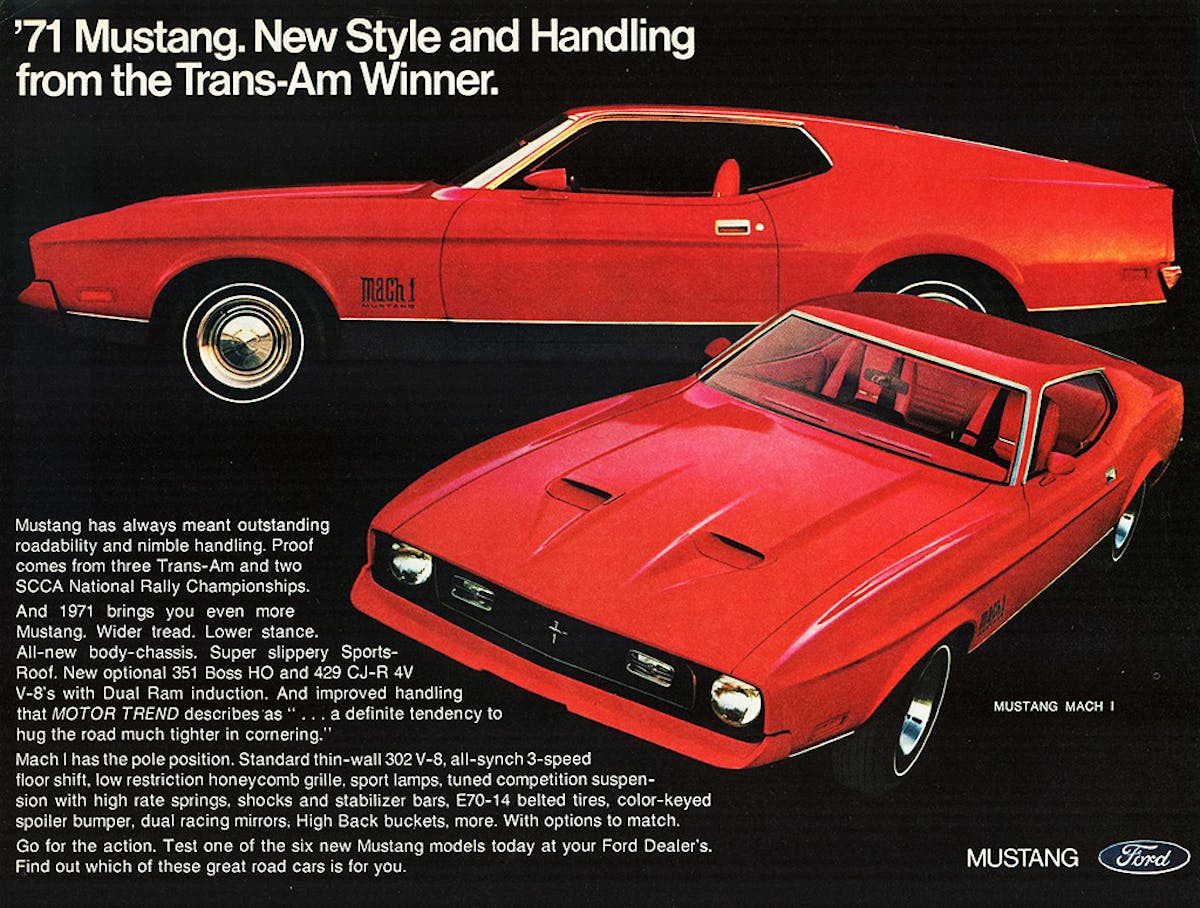 Almost as big as the Torino, its divisional sibling, the 1971 Mustang was more Clydesdale than a pony. The new model came in three flavors, a coupe, convertible, and a wild fastback sporting an almost horizontal roofline. It was as if the designers at Ford sent the Mustang into a hip Hollywood boutique and it emerged two sizes bigger, packed into a halter top and flowery bellbottoms.