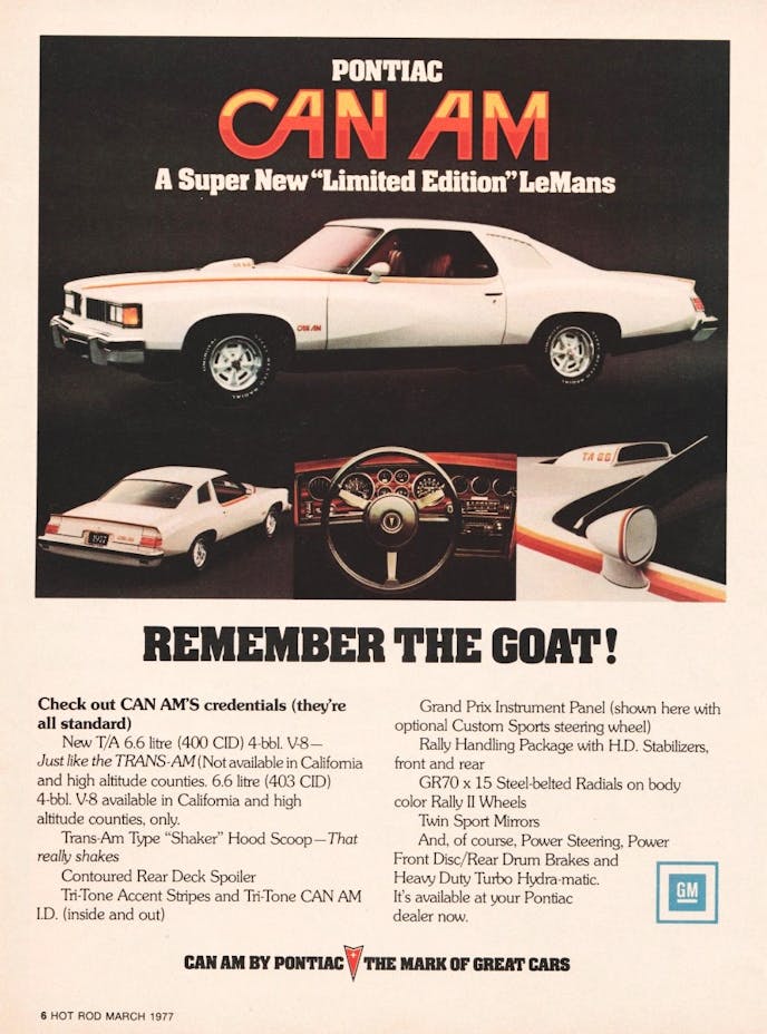 Meanwhile in Detroit, the Pontiac Trans Am was hot, hot, hot. It was selling briskly and the bigwigs at Pontiac were so happy they could hardly count. They hatched an idea to transfer Trans Am DNA over to the slow-selling “Colonnade” Le Mans mid-size model. Additionally, the GTO was gone for 1975, so Pontiac brass hoped the “tape and decal” Can Am would fill the hole left in its lineup. Essentially a Le Mans with a shaker hood, tape stripes, and a rear spoiler, it was Trans Am’s big brother.