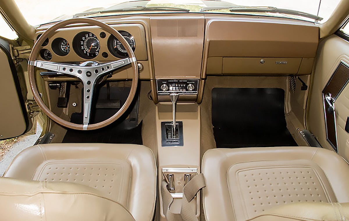The front end featured what AMC referred to as a “Twin Venturi” look, with pod-mounted headlights at the corners framing a recessed, split honeycomb grille. Round turn signals were recessed directly below the headlights in a wraparound, full-width, chrome bumper. A steeply raked windshield led to the aforementioned low roofline.