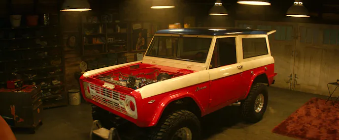 Charlie’s Bronco, a custom painted, red, white, and blue ’68 Wagon nicknamed “Marge”, is heavily modified with a body lift kit, large off-road tires and wheels, and a customized interior. She has yet to put an engine in it at the time of the time of the story, owing to the fact that she has put a hiatus on the restoration to focus on work.