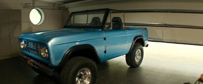Beau’s Bronco is a light metallic blue, late sixties Bronco, also lifted, and appears in the movie sans any sort of top.