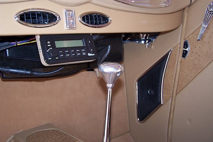 A Secret Audio head unit is contained in a flip down panel under the dash, and the Alpine and Hertz speakers are either hidden or housed behind hand fabricated speaker grills that contain the Victoria logo. While a Vintage Air unit modulates the temperature, the original cowl vent also remained operational by adding a small electric motor that allows it to open and shut even with the additional wiring and electronics contained behind the dash. A banjo steering wheel from the Wheel Shoppe completed the interior.
