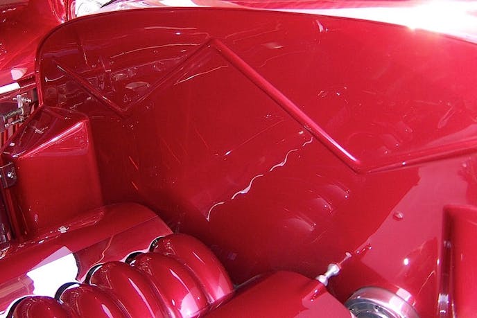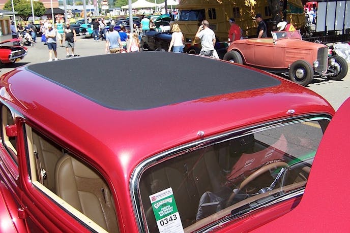 Axalta‘s Spies Hecker Ford G2 Redfire Metallic paint was applied to all exterior surfaces, but not before John had devised a steel insert to go in place of the cloth roof, with Dynamat to keep it quiet and covered with Haartz cloth, the same material used in OEM applications on high-line vehicles. Now noise free and leakproof, the insert could at any time be removed and a new folding top installed to emulate the original.