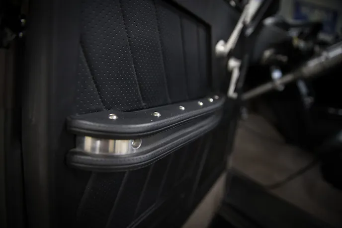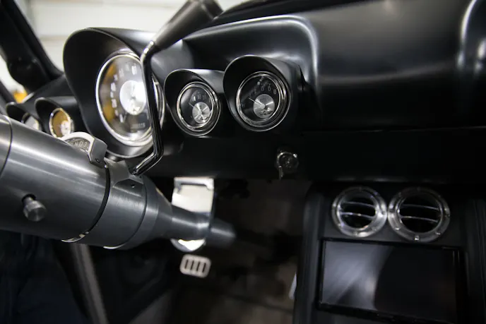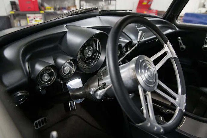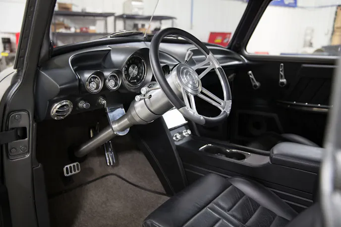 Inside, the interior is 100-percent custom and features a Restomod A/C system, ididit steering column, Billet Specialties steering wheel, and Clayton Machine Works window cranks and handles. The custom interior was stitched in house using Relicate leather and carpet.
