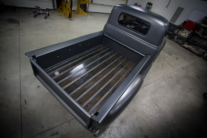 Both doors, the bed, fenders, and running boards are new sheet metal from Antique Auto Parts and Sale. The hood is a one-piece hood and all of the parts were carefully fitted to the cab and frame so that everything lines up perfectly. The striking charcoal paint color on the car is a PPG paint mix sprayed in house by the folks at Sparks Speed Shop. “The color is a mixed metallic charcoal grey with a satin clear coat,” Ben explained.