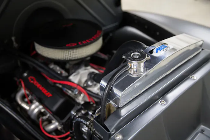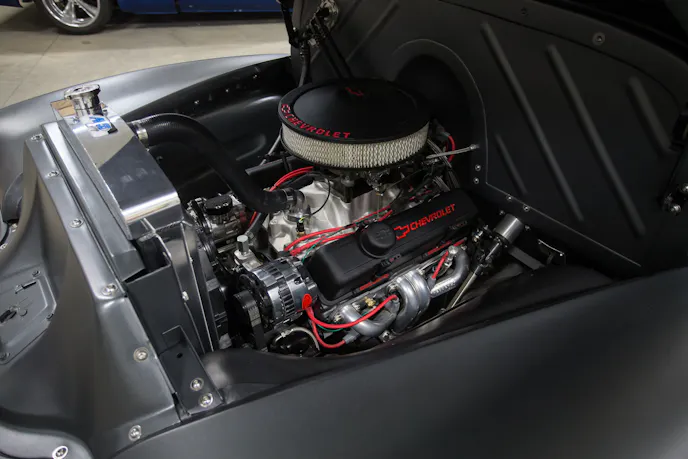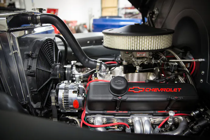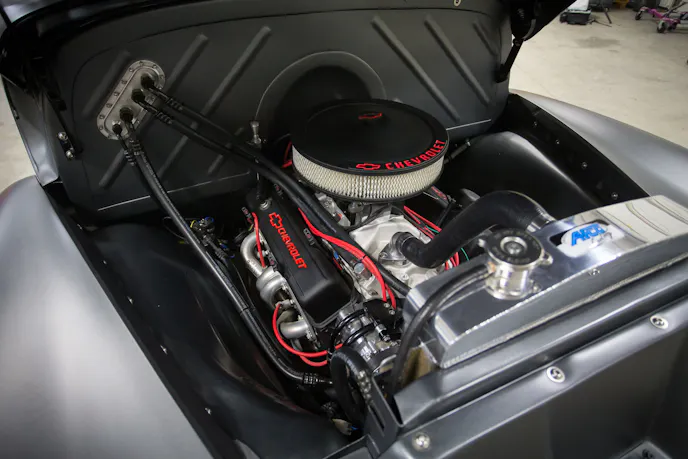 Made for more than just look, this beautiful Chevrolet small-block will have no trouble pulling this truck down the highway. The black accessories and red accents really add to the overall look under the hood and compliment the entire build.