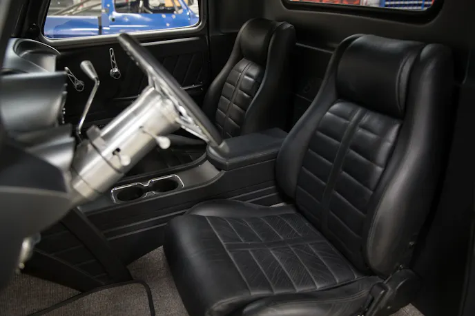 The instrument cluster is out of a 1959 Impala and was custom fit to the dash of the truck. The ’59 Cluster has also been upgraded with Classic Instruments‘ gauges for a  high-performance and accurate readout on the truck’s current status as it’s cruising down the road. The interior also features a high-end Kenwood stereo system for quality tunes while cruising, and blue ambiance lighting for the best possible interior accents at night.