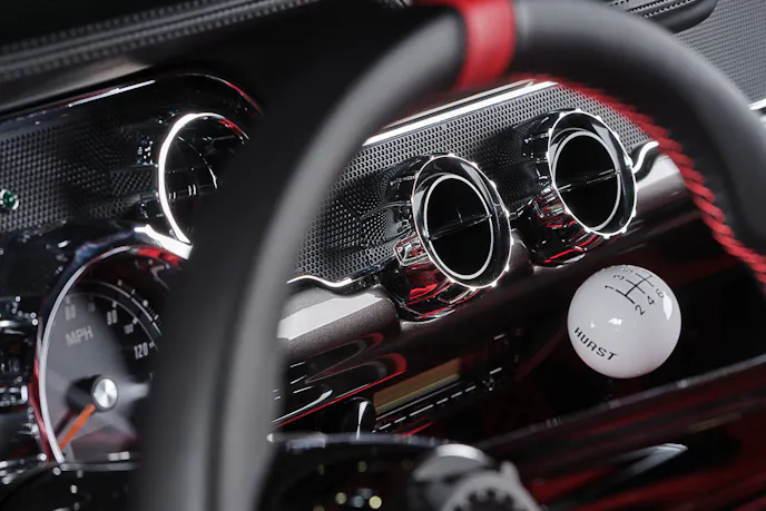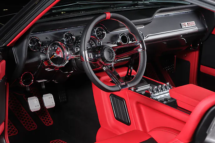 Inside the Mustang, you’ll find a unique interior that uses 3D-printed and machine-aluminum parts. Gabe’s Custom Interiors took care of adding all the leather and upholstery needs of the vehicle. A set of Dakota Digital gauges fills the instrument cluster inside the Mustang’s cabin.