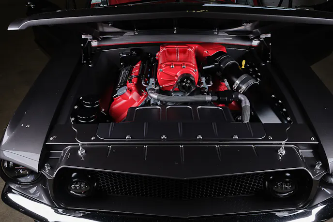 Shaffer’s Mustang gets its athletic stance thanks to suspension components from Detroit Speed, RideTech, and Hypercoil. Ironworks Speed & Custom built a one-off rear frame clip that connects the four-link suspension to the 9-inch rearend. The custom EVOD wheels are wrapped around a big set of Wilwood disc brakes and wear Michelin rubber.