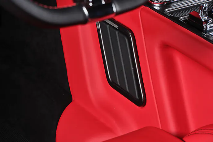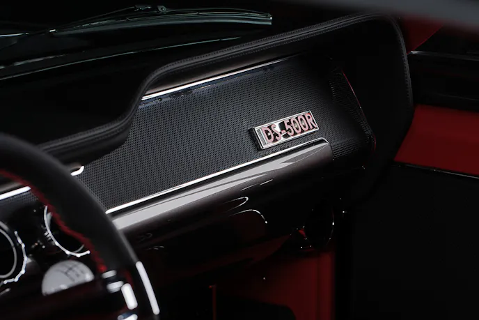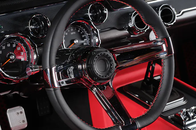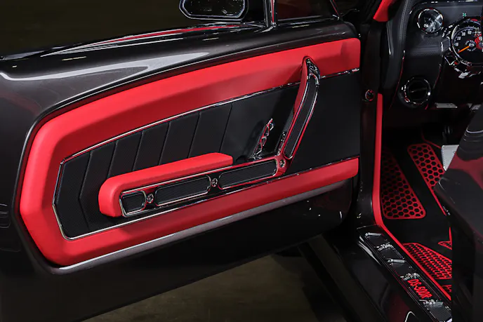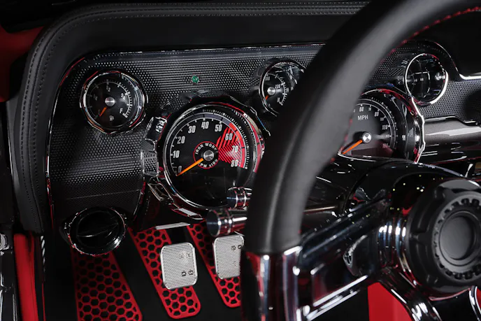 Inside the Mustang, you’ll find a unique interior that uses 3D-printed and machine-aluminum parts. Gabe’s Custom Interiors took care of adding all the leather and upholstery needs of the vehicle. A set of Dakota Digital gauges fills the instrument cluster inside the Mustang’s cabin.