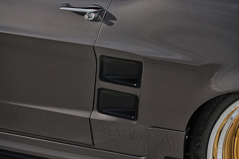 The body of the Shaffer’s Mustang went through an extensive transformation that didn’t detract from the car’s OEM look. The fenders and quarter panel scoops have been widened, the bumpers were narrowed to create a flush fit, and numerous other custom touches were added. The PPG metallic gray paint was laid down by Cotati Speed Shop, and Sherm’s Custom Plating took care of all the chrome work.