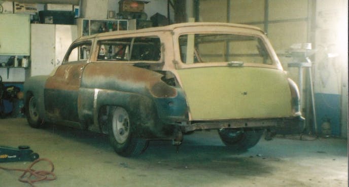 Braces were added to support the length of the top and the ’56 Ford wagon side windows were chopped 4.5-inches to match the new angled front pillars. The Merc then needed new quarters in order to match up to the Ford side windows so Dave hand-built the quarters and added ’52 Mercury taillights to them.